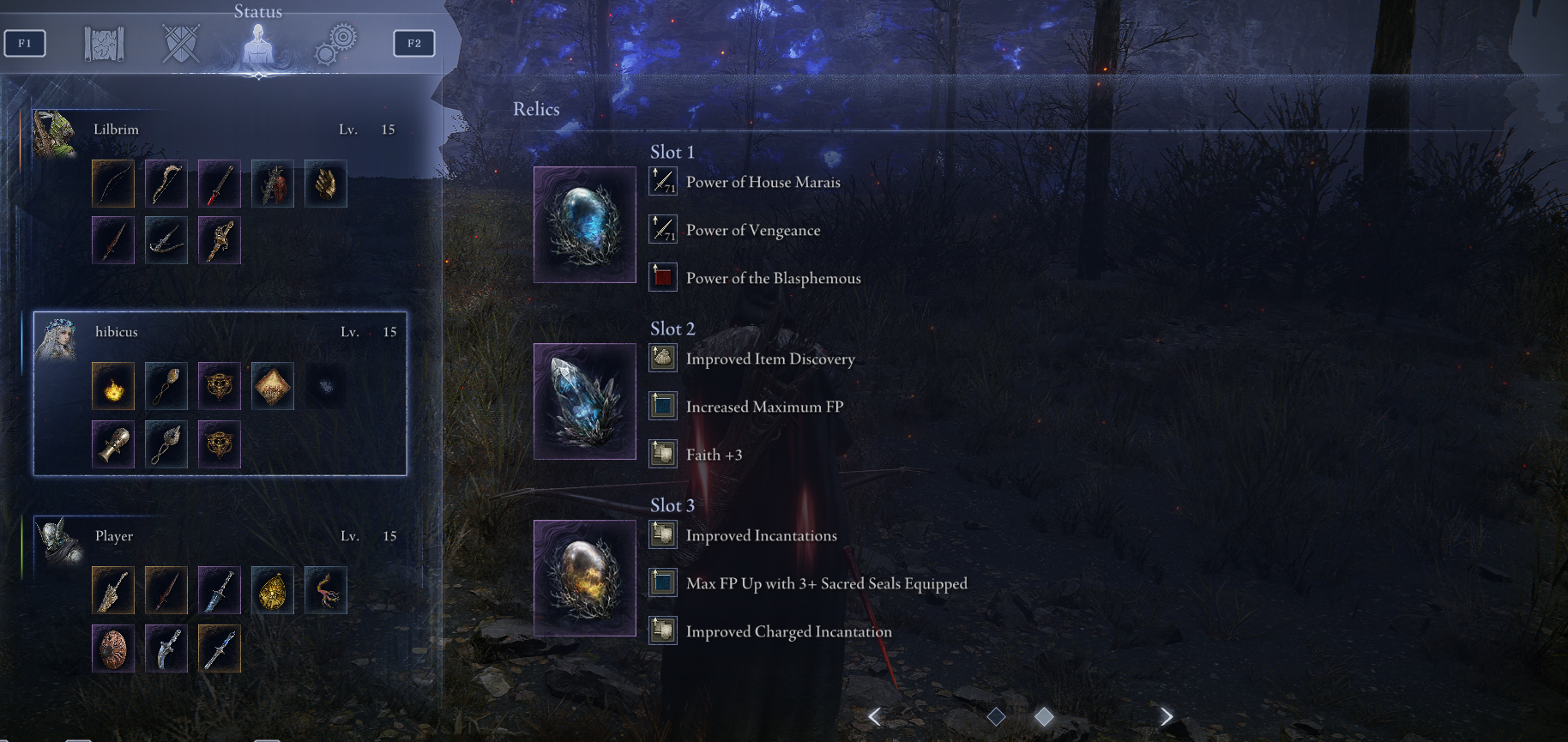 В выпадающем окне просто выбираете необходимые перки. Чтобы реликвии сработали после редактирования, необходимо выйти в главное меню и снова зайти в персонажа.
