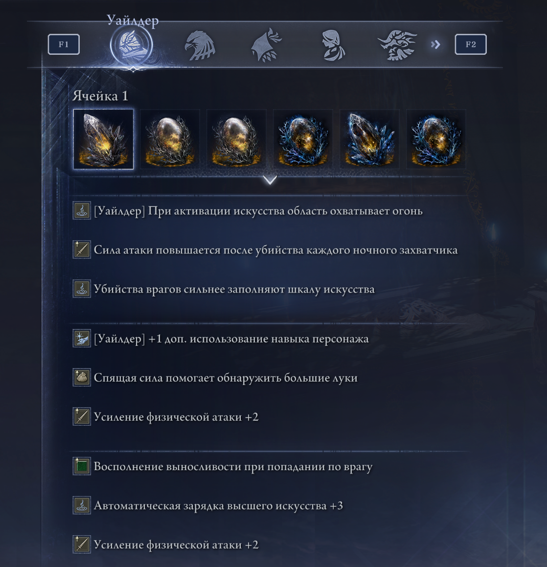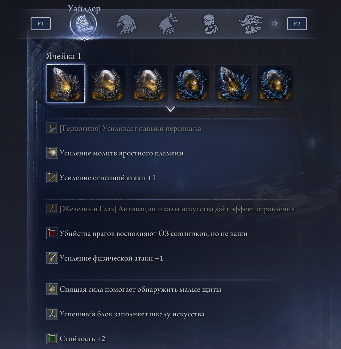 Эффекты, накладываемые на стартовое оружие, также важны. Если вы хотите минимум-рнг билд и забилдиться под стартовое оружие, сначала выбирайте наполнение оружия, а уже потом Пепел Войны. Как пример, если сначала поставить Пепел, то потом может выпасть только резист или усиление атаки рядом с замороженными: