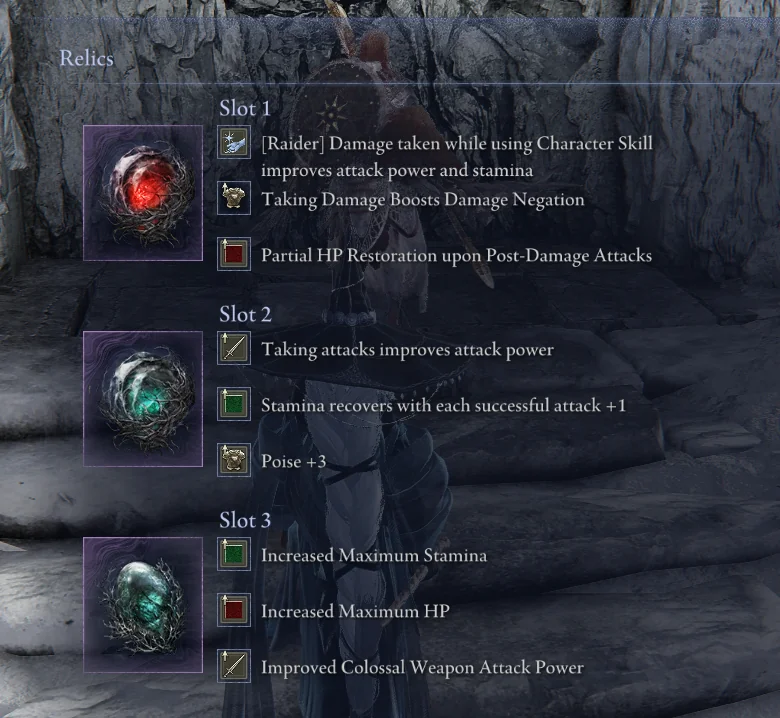 Тут менее очевидно: в обычных реликвиях невозможно получить второй перк первой реликвии, второй перк второй реликвии (существует только Stamina Recovery upon Landing Attacks) и два первых перка третьей реликвии.